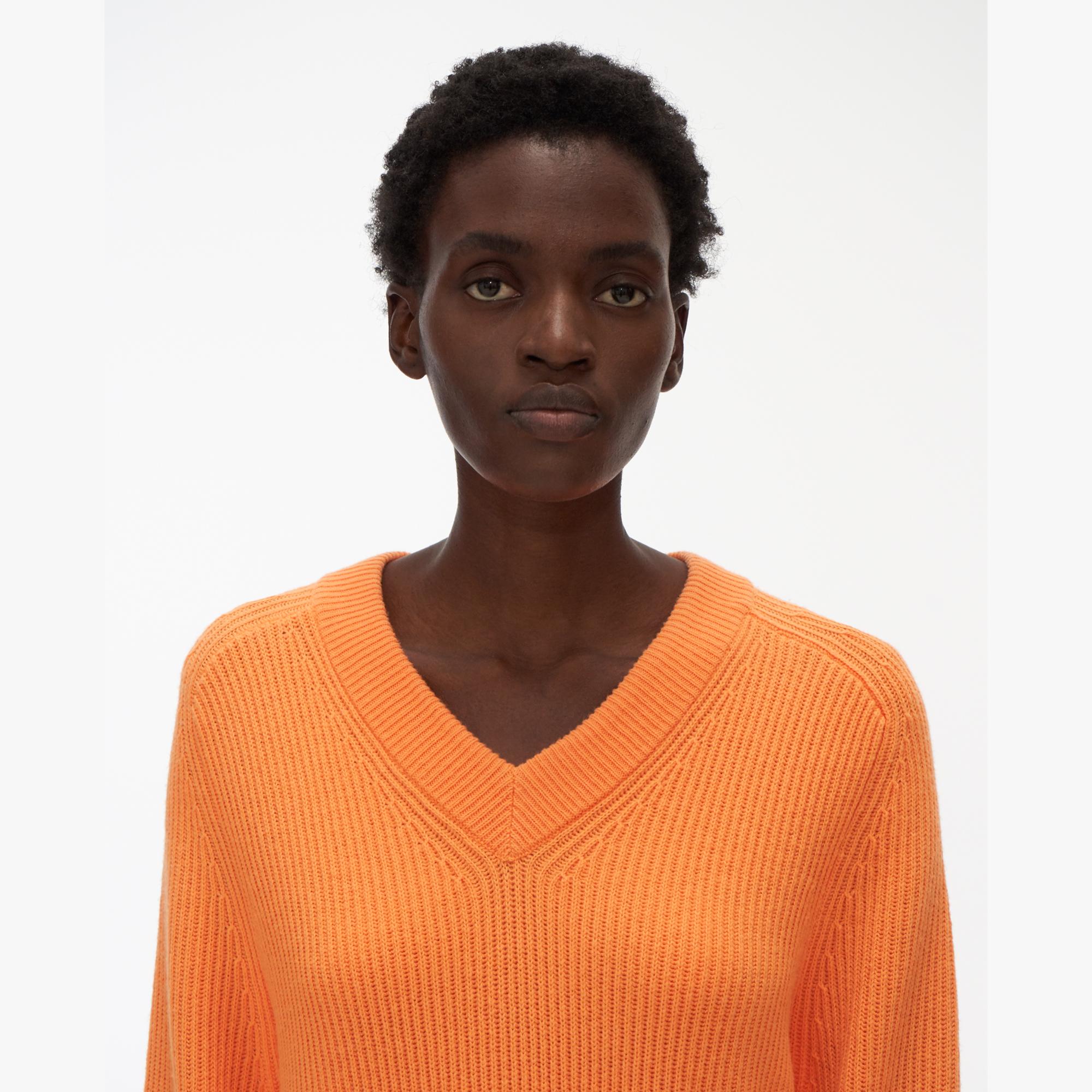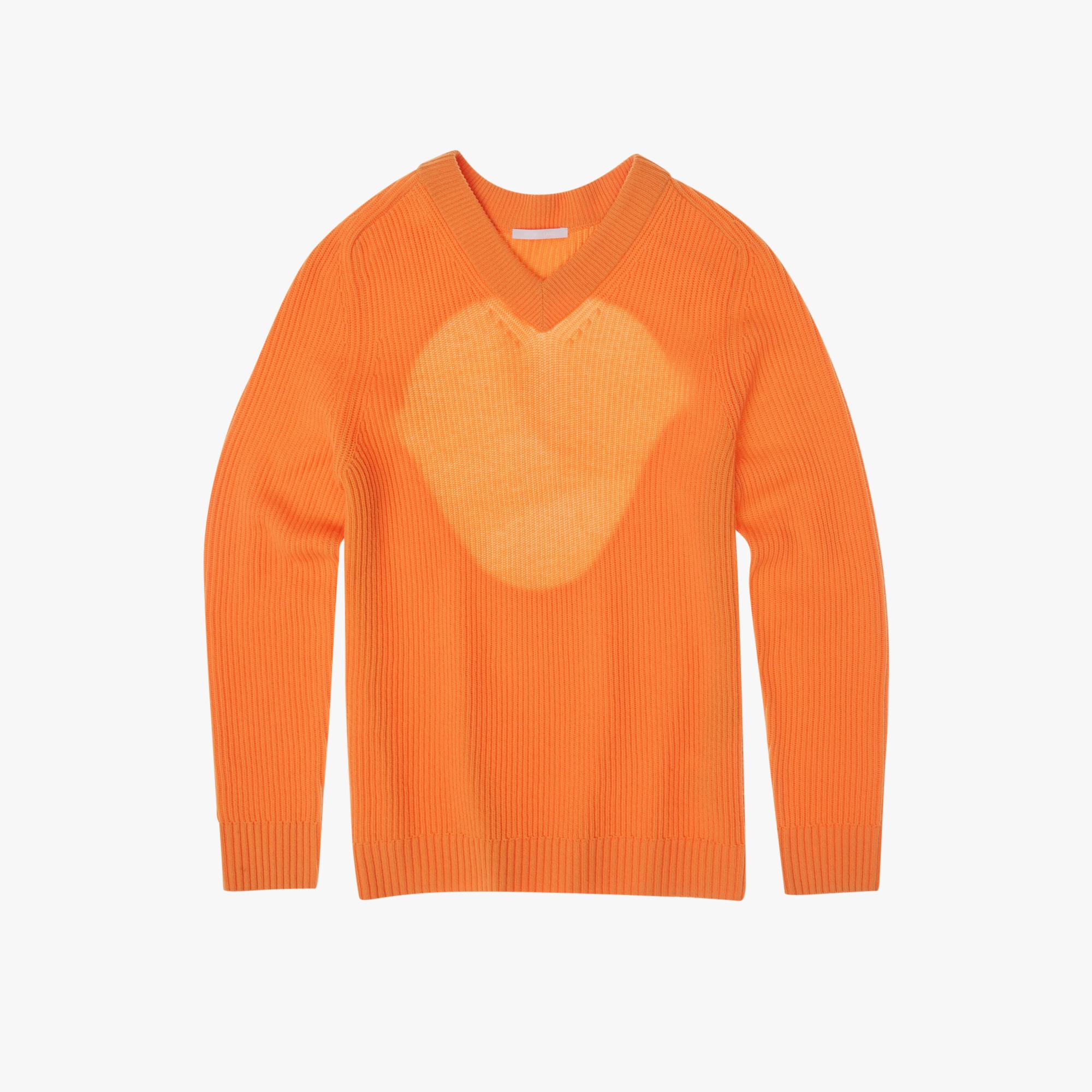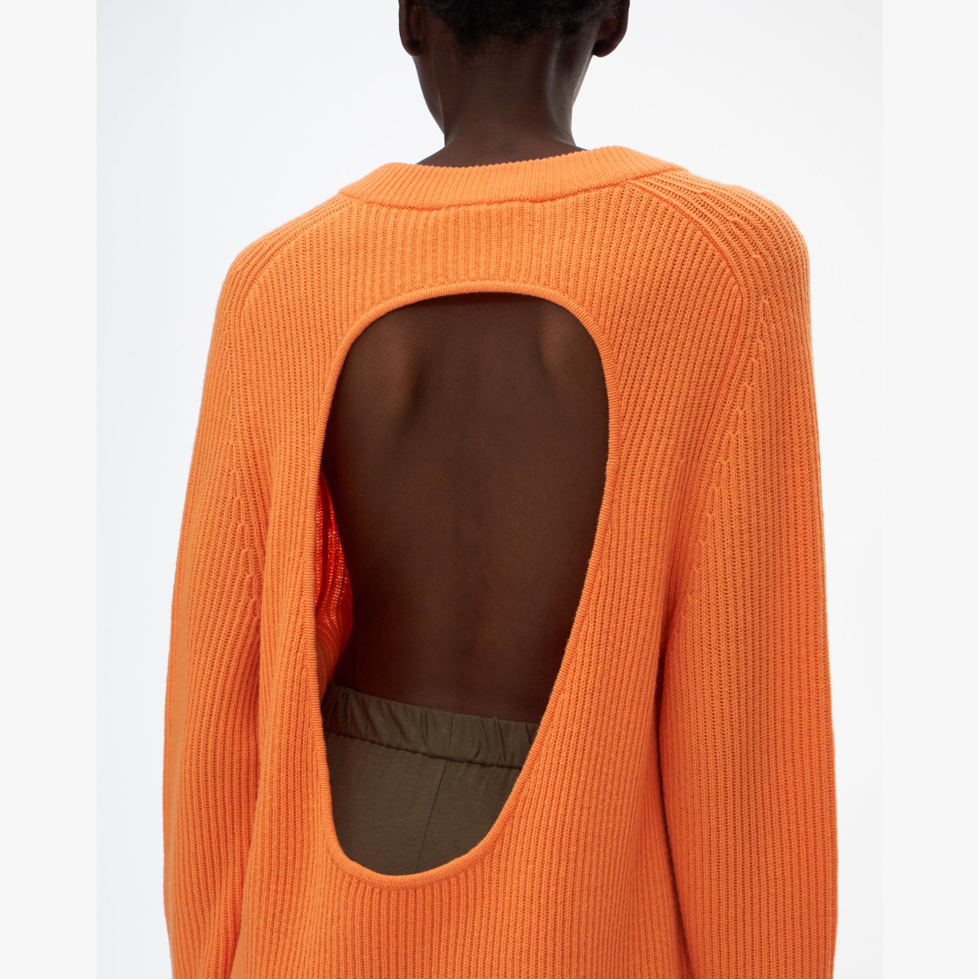 The Helmut Lang Cutout V-Neck Sweater is a wool-cashmere blend knit with an oversized fit and ribbed trim