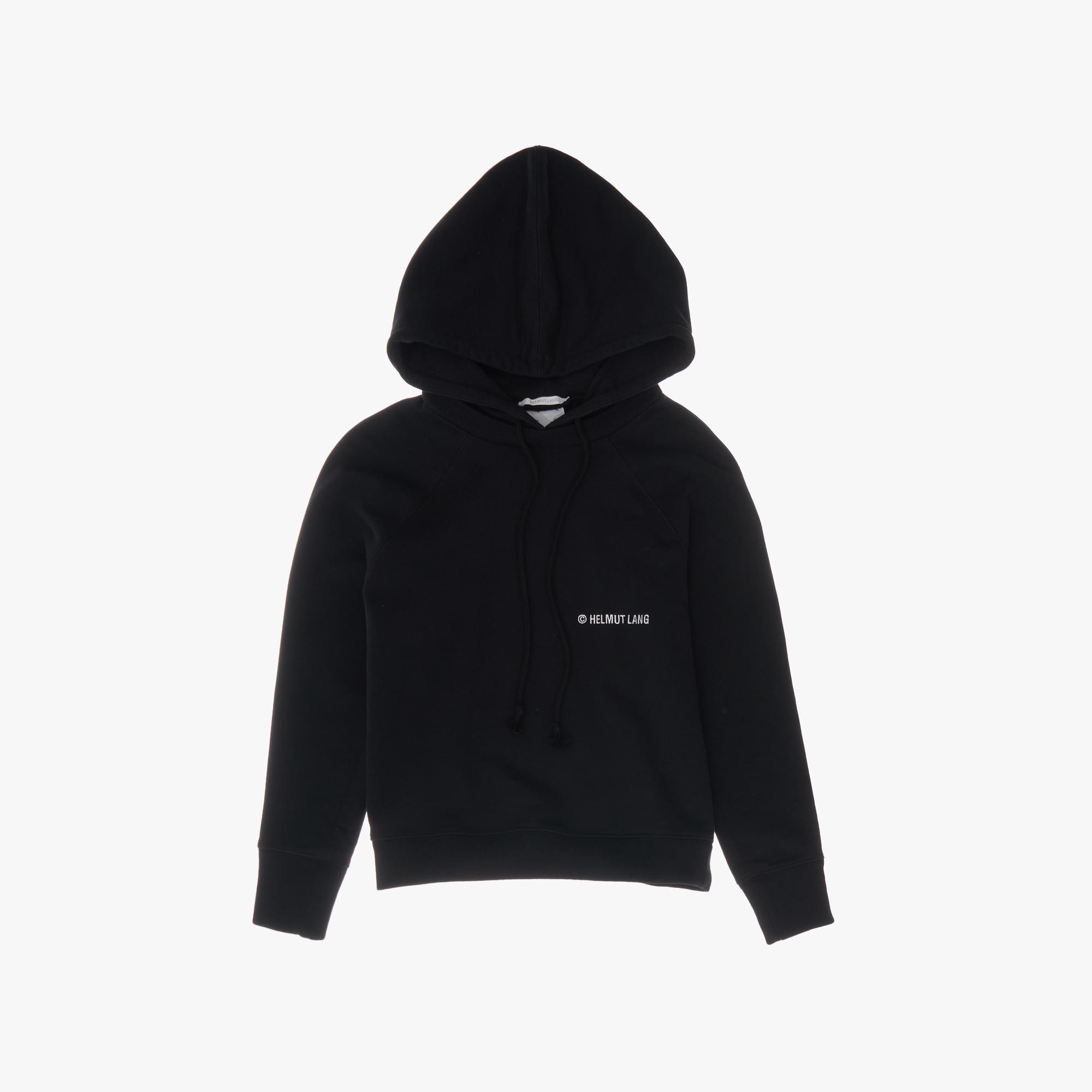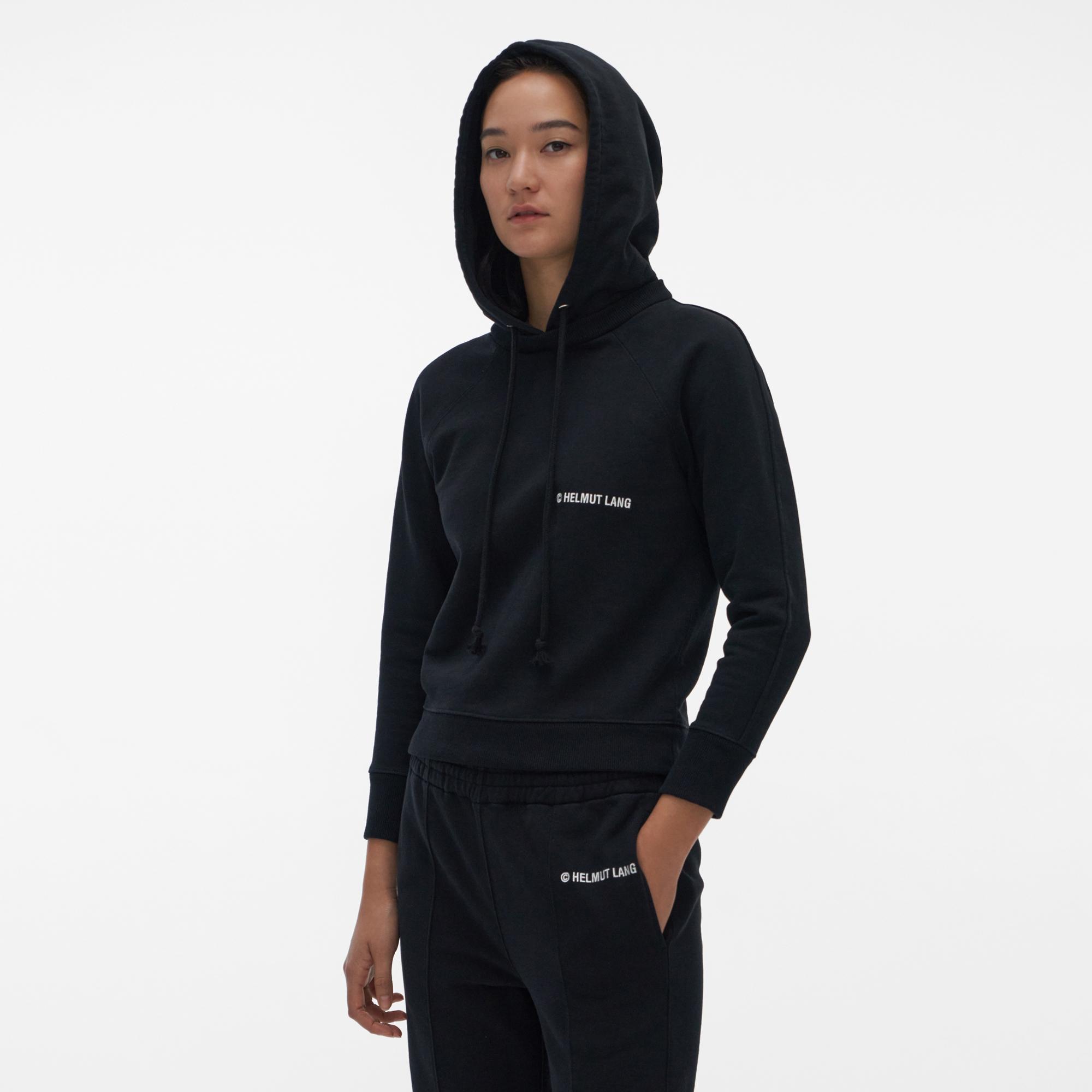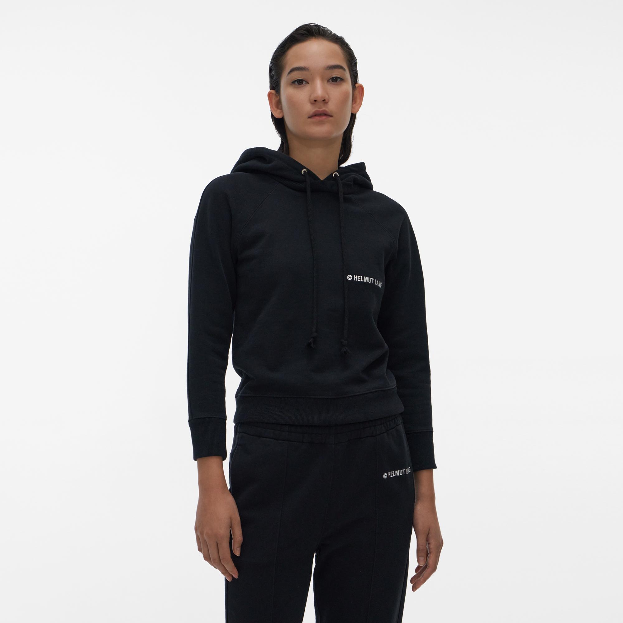 The Helmut Lang Shrunken Hoodie is a classic sweatshirt with a shrunken fit, drawstring hood, and graphics on front