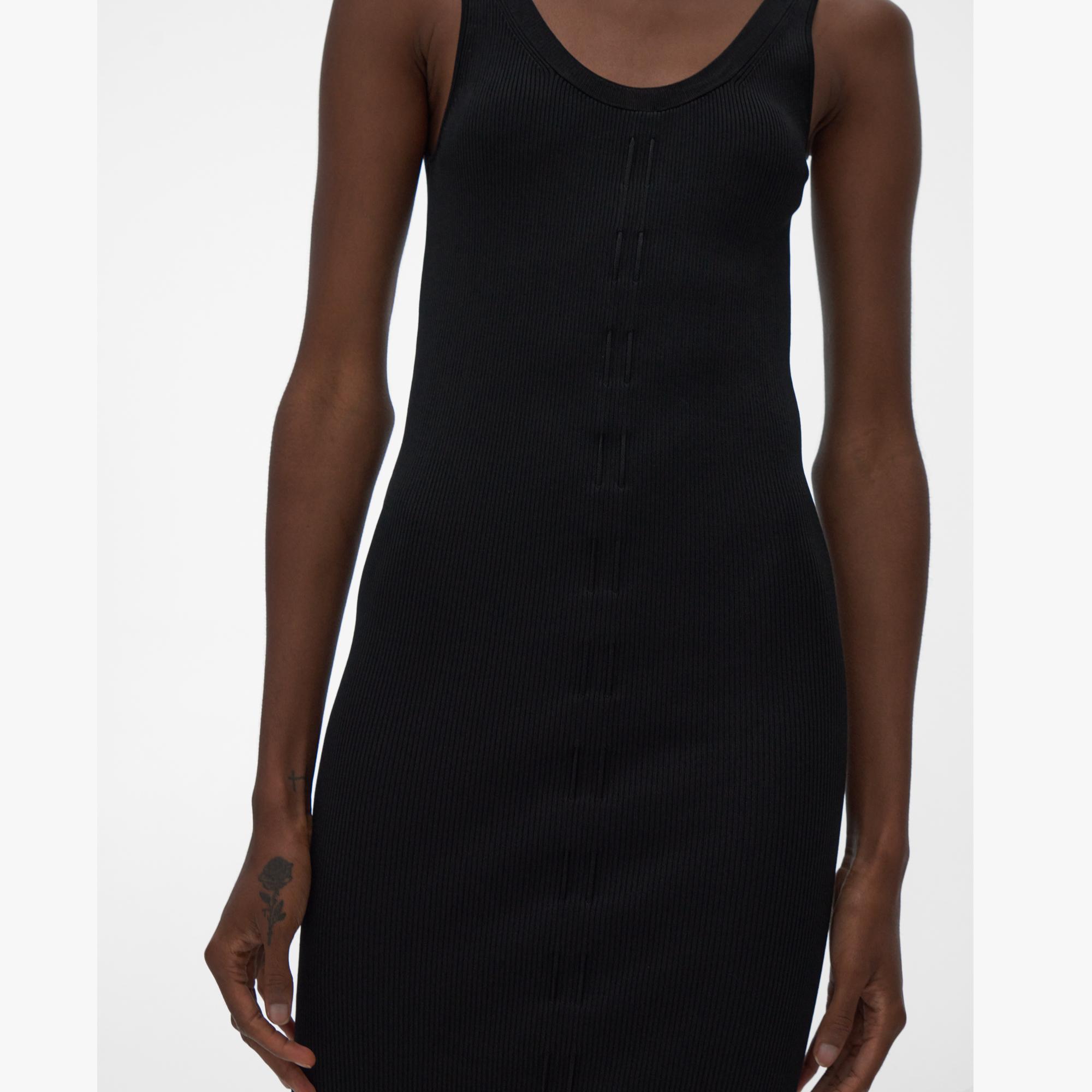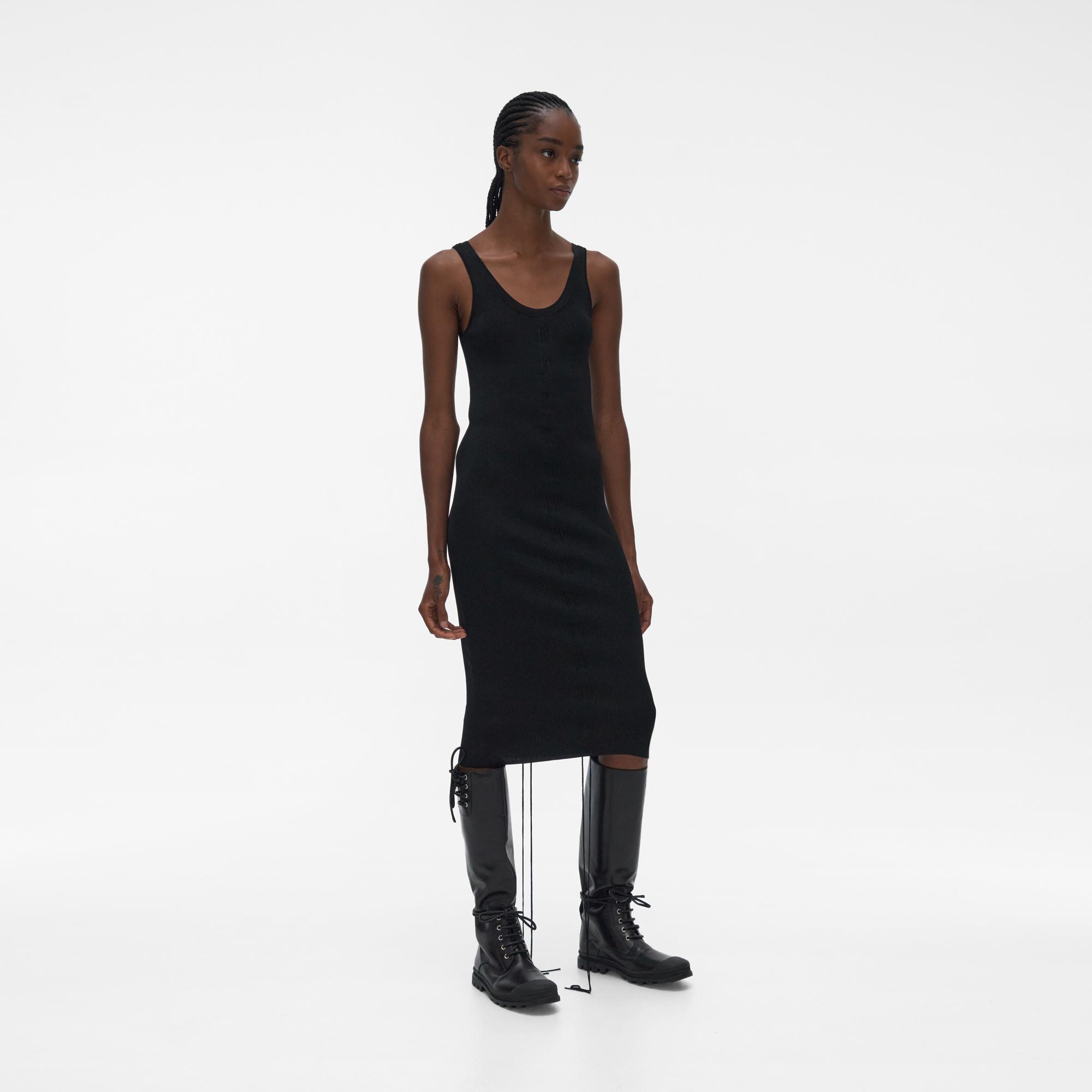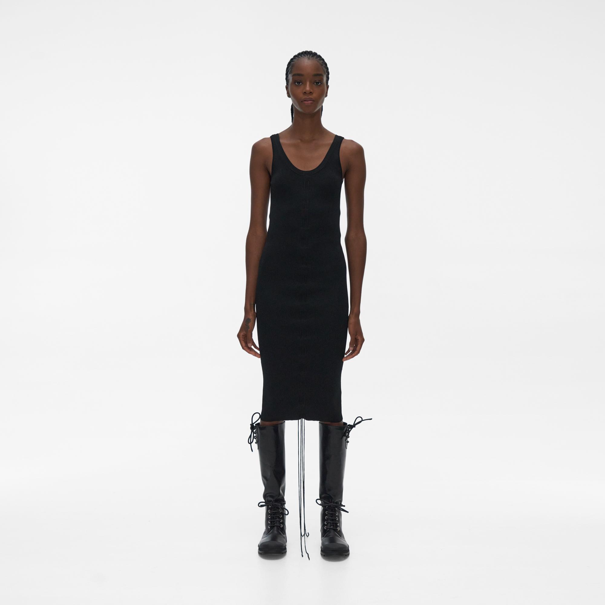 The Helmut Lang Lacing Dress is a stretchy ribbed dress designed with a round neckline and a laced-center front detail