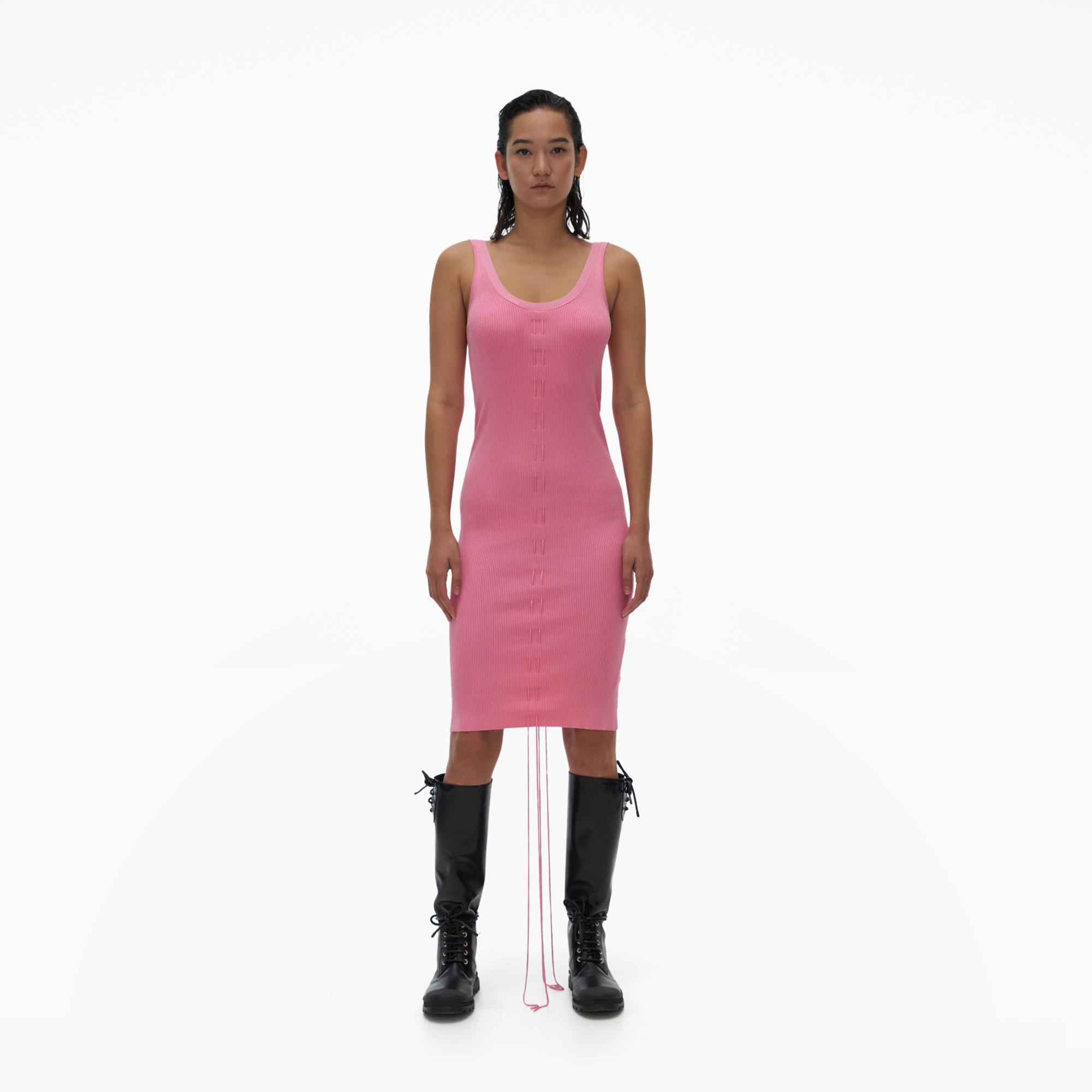 The Helmut Lang Lacing Dress is a stretchy ribbed dress designed with a round neckline and a laced-center front detail
